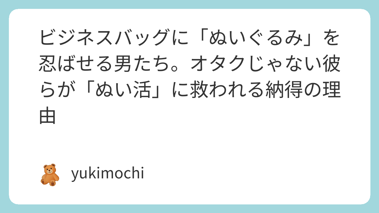 出典:ダイヤモンド・オンライン – オタクじゃないのになぜ…「ぬいぐるみ」を持ち歩く大人の男性が急増する納得のワケ